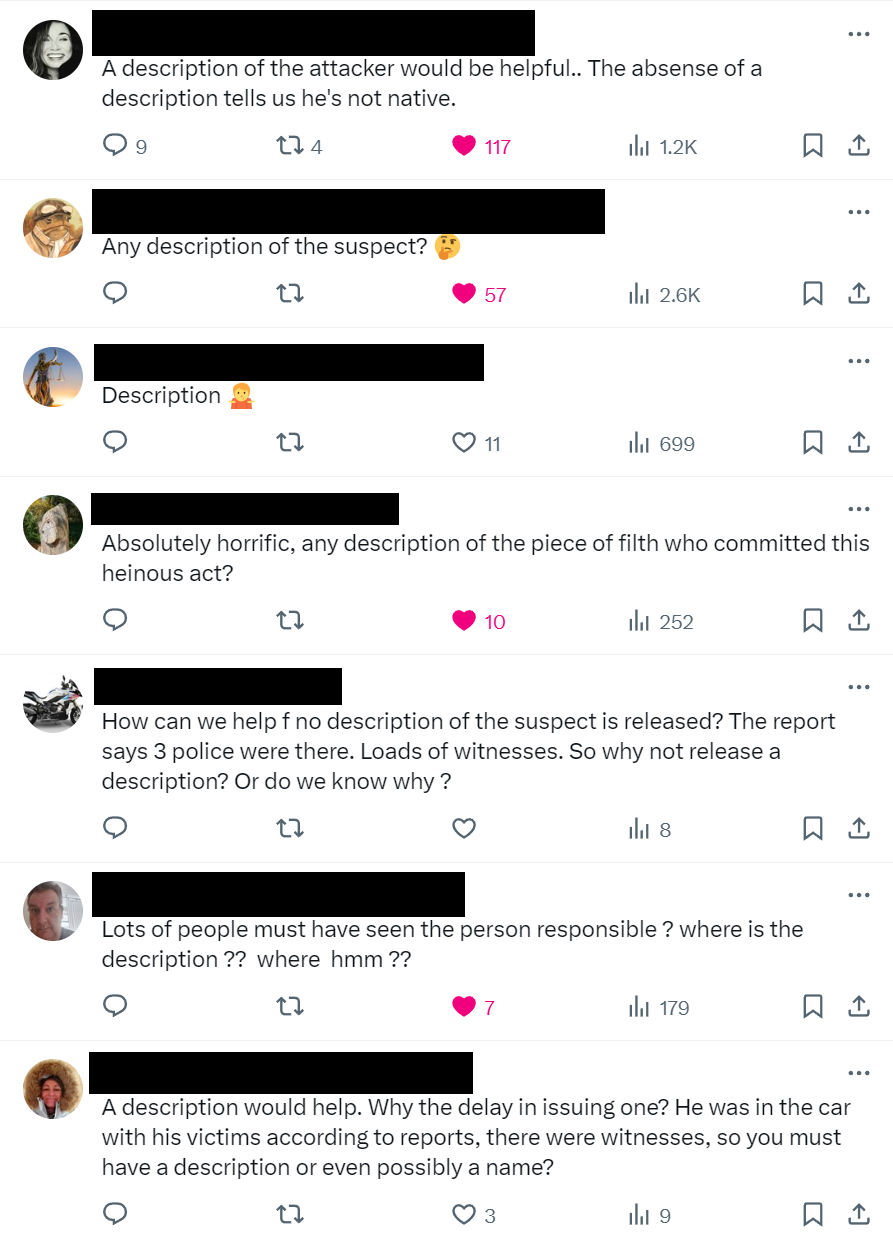 It’s clear from the response to the Met’s appeals on X that there’s a degree of cynicism about this. Almost every response to their post asked for a description of the attacker; some went further, stating that as no description had been provided “he’s not native”, or just “we know why”.